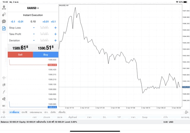 การเทรดทองคำ 0.10 lot จะเริ่มขึ้นแล้ว หลังจากนักเทรด กรอกจำนวน lot แล้วคลิ๊กปุ่ม Sell หรือ Buy การเทรดจะเริ่มขึ้น
