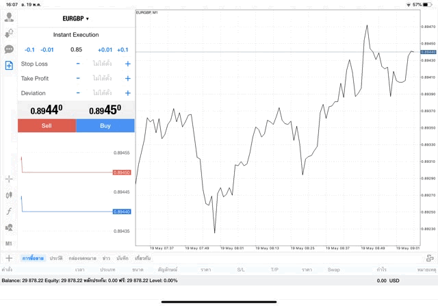 การเทรด Forex EURGBP 0.85 lot จะเริ่มขึ้นแล้ว หลังจากนักเทรดกรอกจำนวน lot แล้วคลิ๊กปุ่ม Buy หรือ Sell การเทรดจะเริ่มขึ้น