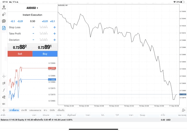 การเทรด Forex AUDUSD 0.50 lot จะเริ่มขึ้นแล้ว หลังจากนักลงทุนกรอกจำนวน lot แล้วคลิ๊กปุ่ม Sell หรือ Buy การเทรดจะเริ่มขึ้น