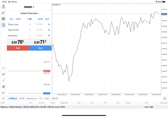 การเทรด Forex EURGBP 1.50 lot จะเริ่มขึ้นแล้ว หลังจากนักลงทุนกรอกจำนว lot ที่ต้องการเทรดแล้วคลิ๊กปุ่ม Sell หรือ Buy การเทรดจะเริ่มขึ้น