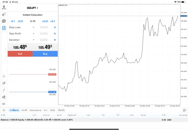 การเทรด Forex USDJPY 0.70 lot จะเริ่มขึ้นแล้ว หลังจากนักลงทุนกรอกจำนวน lot ที่ต้องการเทรดแล้วคลิ๊กปุ่ม Buy หรือ Sell การเทรดจะเริ่มขึ้น